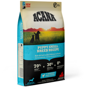 Acana Puppy Small Breed es un pienso sin cereales especialmente formulado para cachorros de razas pequeñas. Elaborado con un 70 % de ingredientes animales de alta calidad como pollo y pavo de corral, huevos frescos y pescado salvaje, ofrece una dieta rica en proteínas y grasas saludables que favorece un crecimiento sano, el desarrollo muscular y la energía necesaria para esta etapa intensa.
