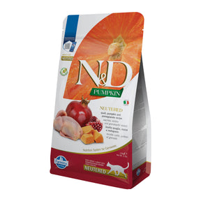 El pienso sin cereales para gatos esterilizados de Farmina N&D Pumpkin combina codorniz, granada y calabaza, ofreciendo una nutrición de alta calidad que favorece la digestión, el control de peso y el bienestar general del gato adulto.
