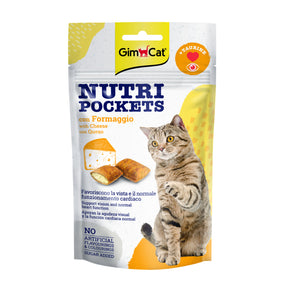 GimCat Nutri Pockets Queso Taurina son snacks crujientes de cereal con un relleno de queso delicioso, diseñados para premiar o consentir a tu gato entre comidas. Enriquecidos con taurina, un aminoácido esencial para los felinos que favorece la salud ocular, cardíaca y reproductiva. Con menos de 2 kcal por unidad, ayudan a cuidar su peso mientras disfrutan de un sabroso premio.