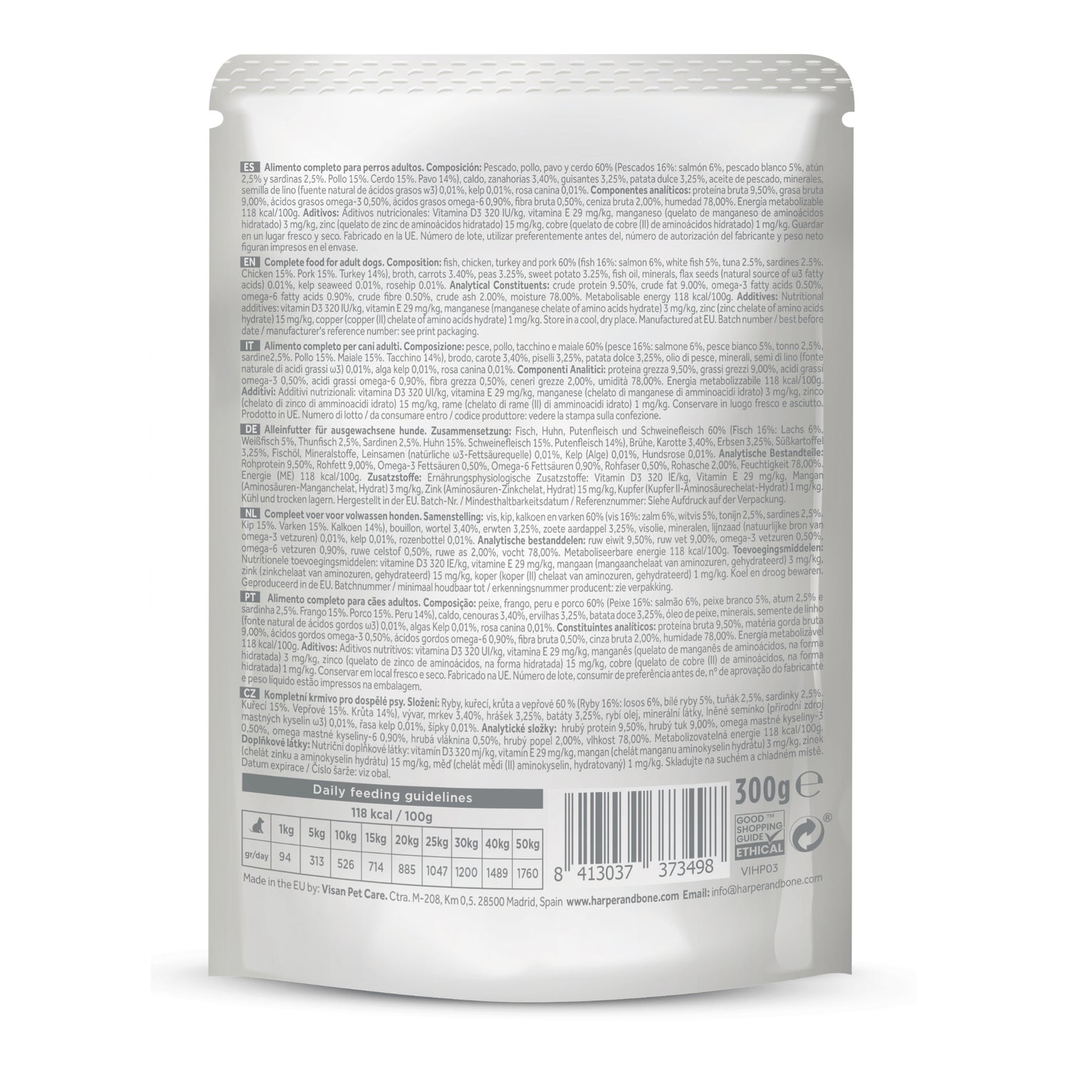 Es un alimento húmedo para perros adultos. Ofrece una receta sin cereales (Grain Free) que combina pollo y pescado como fuentes de proteínas de alta calidad, junto con vegetales, ideal para una dieta equilibrada y digestible.