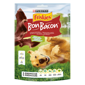 Es un snack blando y sabroso para perros con aroma a bacon, ideal como premio en cualquier momento del día. Su fórmula contiene ácidos grasos Omega 3 y 6 para una piel y pelaje saludables, vitamina B para mantener la energía, y es bajo en grasas. No contiene colorantes, conservantes ni aromatizantes artificiales.