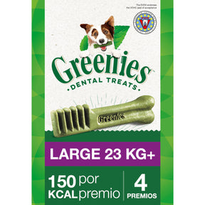 Greenies Large es un snack dental funcional especialmente diseñado para perros de razas grandes. Ayuda a prevenir y combatir la acumulación de placa, el sarro y el mal aliento de forma efectiva, siendo una de las soluciones más recomendadas por veterinarios como alternativa al cepillado. Su textura, forma y composición favorecen la masticación y limpieza dental mientras cuida el sistema digestivo.
