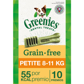 Greenies Grain Free Petite es un snack dental sin cereales ideal para perros pequeños de entre 8 y 11 kg. Su textura masticable única y sus múltiples puntos de ruptura favorecen una limpieza eficaz de los dientes, ayudando a reducir la acumulación de placa bacteriana, sarro y mal aliento. Está elaborado con guisante y patata 100% naturales y es libre de gluten, lo que lo hace perfecto para perros con intolerancias alimentarias.